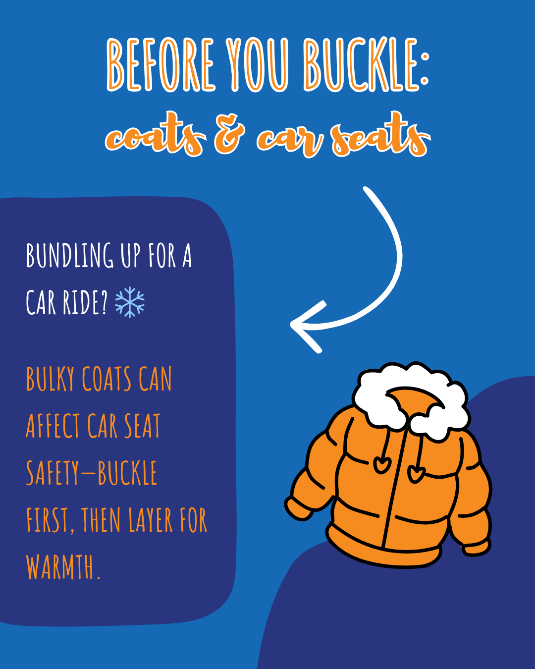 We all want our kids to stay warm *and* safe this winter ❄️ Bulky coats can interfere with proper car seat buckle fit, putting little ones at risk. Instead, buckle your child in first, then use a blanket or coat over the harness for warmth.